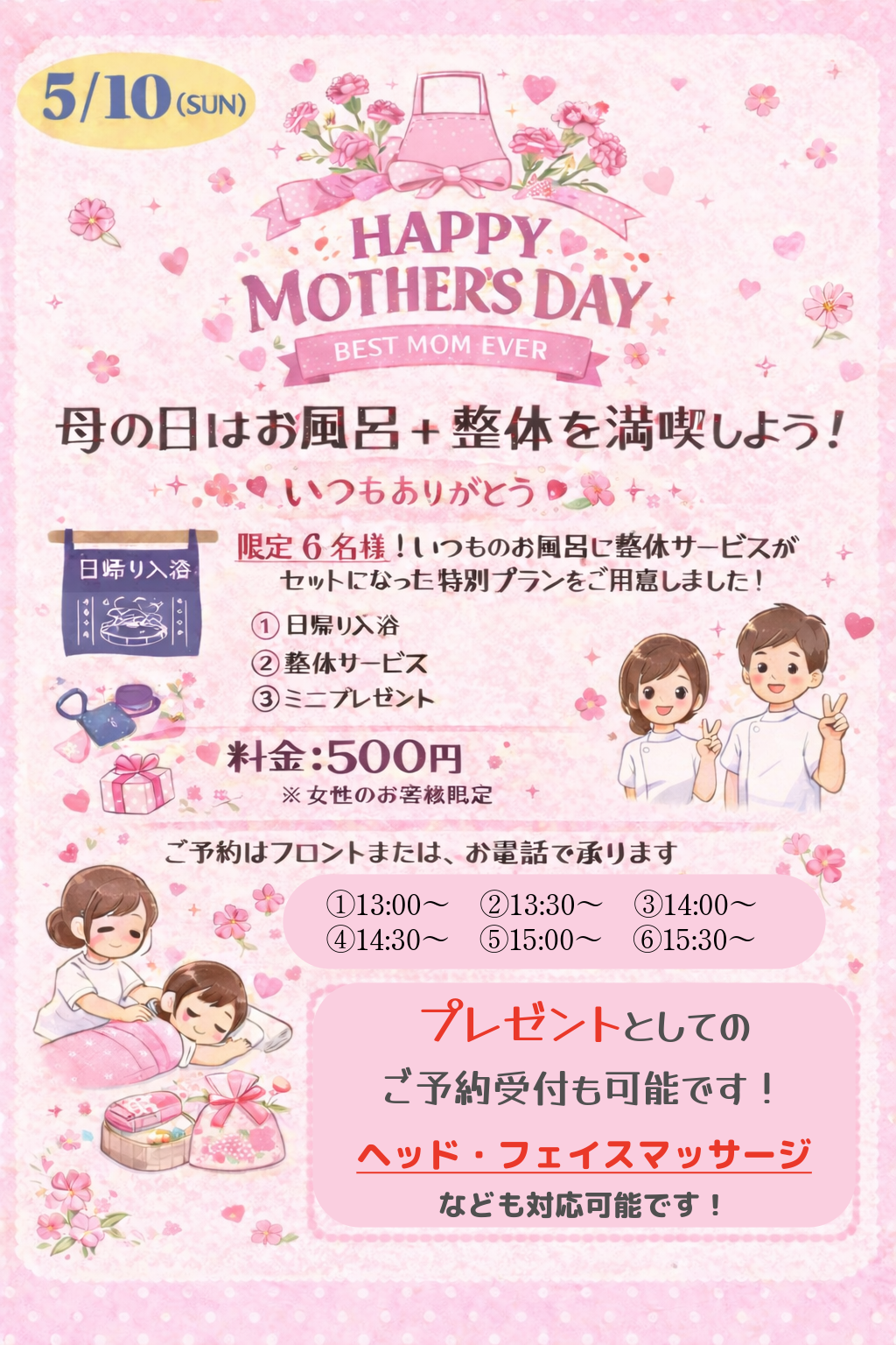 ②6名様限定でいつもの日帰り入浴料500円に整体サービス+ミニプレゼント付きの