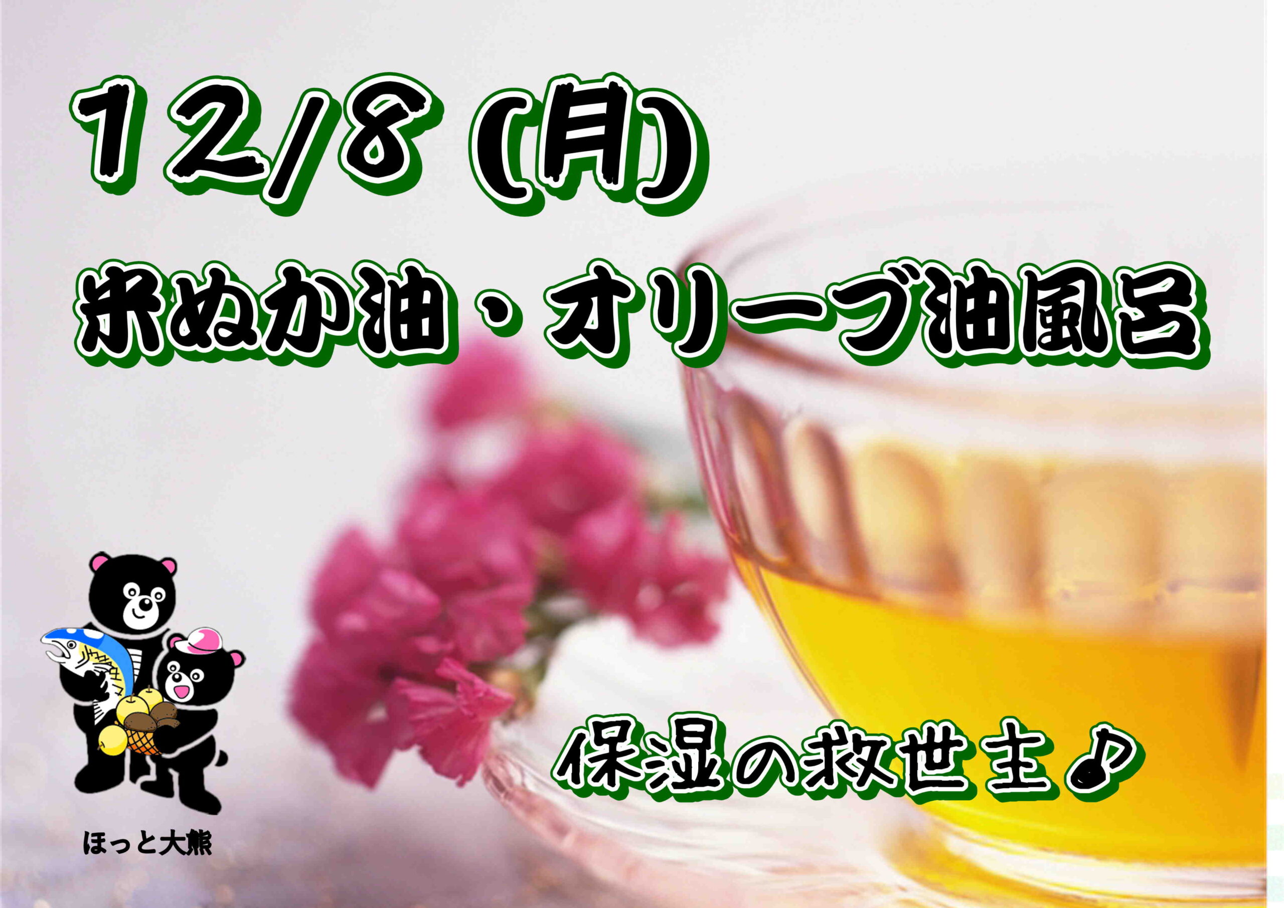 ほっと大熊では12月8日(月)米ぬか油・オリーブ油配合風呂を開催します!