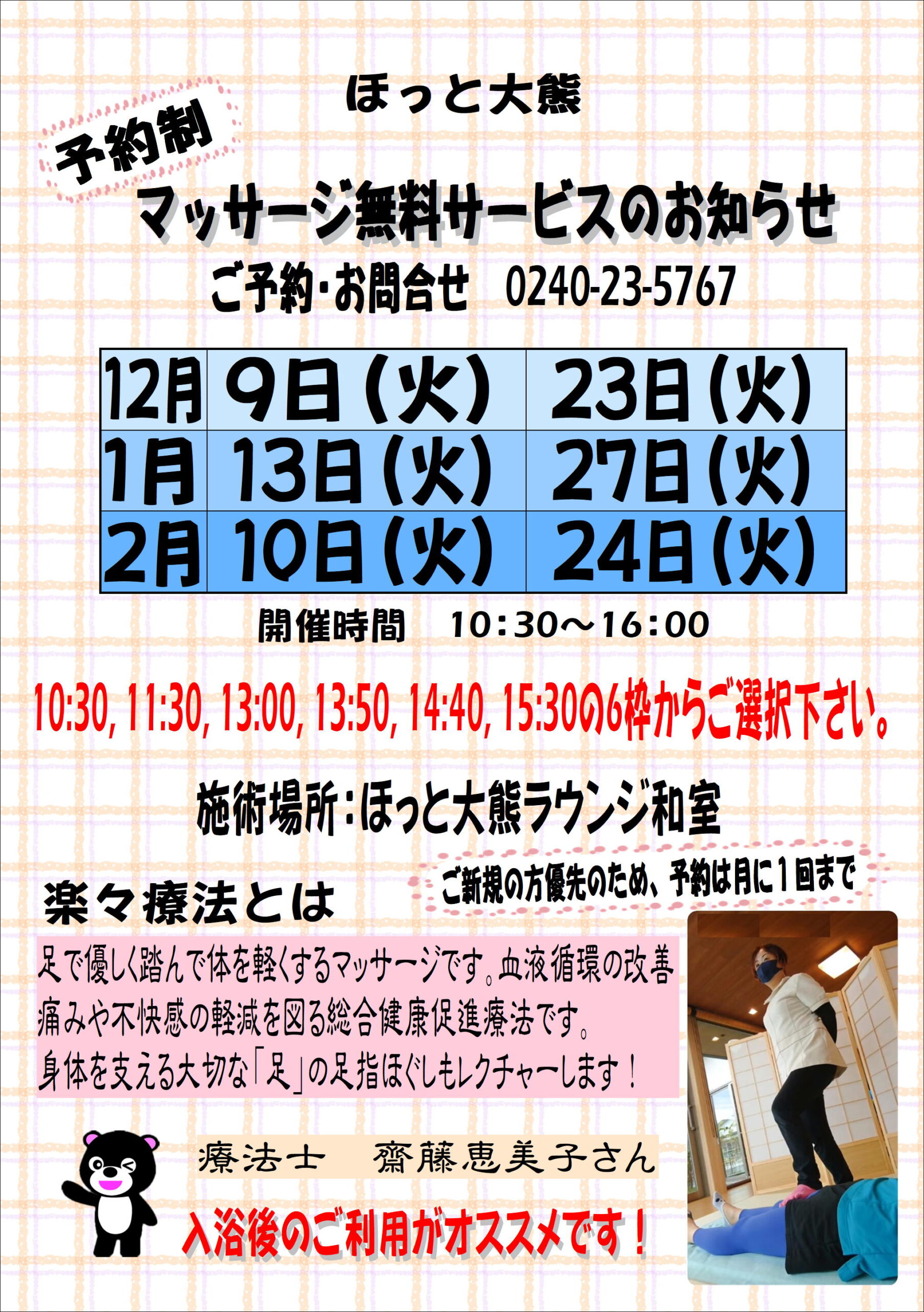 また、翌日12月9日は無料マッサージサービスの開催日となっております。