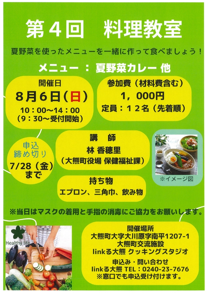菜單:夏季蔬菜咖哩等 日期:8月6日(週日)10:00-14:00(9:30開始報名) 地點:連結 大隈烹飪工作室 參加費(含材料費):1000日圓名額:12人(先到先得) 講師:林香堀(大隈町役所健康福祉課程) 攜帶物品:圍裙、吊帶、飲料 *活動當天請搭配戴口罩並消毒雙手。